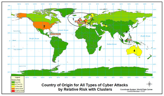 To further the analysis, we look into the relative risk of cyber attacks with cluster. The resulting maps and tables for relative risk analysis are given in this section. The relative risk values, along with the clusters, were obtained by SaTScanTM for each type of cyber attack. Relative risk can be interpreted as “x times more likely than expected” to have a cyber attack originate from that country. Since SaTScanTM calculates different expected counts for each type of attack, the relative risk and break points will be different for each type of cyber attack. The color scheme is explained in the legend on each map.