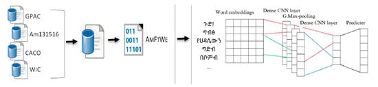 - Rychlý, P.; Suchomel, V. Annotated Amharic Corpora. In Proceedings of the International Conference on Text, Speech, and Dialogue(TSD2016), Brno, Czech Republic, 12–16 September 2016; Springer: Cham, Switzerland, 2016; pp. 295–302. [Google Scholar]