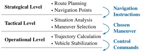 Depending on the perceived environment, appropriate driving maneuvers are derived from navigation instructions within the tactical level. Based on this, the target trajectory and thus the temporal and spatial target positions of the vehicle are calculated on the operational level and in combination with further information passed on to various vehicle controllers. Dynamic driving parameters, such as velocity of the vehicle, are therefore defined in this level. The respective driving trajectory is carried out by transferring the control commands to the vehicle’s motor, brake, and steering [50].