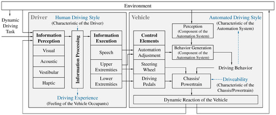In conformity with the aforementioned requirements for the ontology, both the driver and the automation system have to be considered. Accordingly, in addition to the classic ‘human driving style’, the term ‘automated driving style’ is also used, which describes how an automated vehicle drives and can therefore be classified as a characteristic of the automation system. The fundamental distinction between the human driving style and the automated driving style is evident in the driver-vehicle system shown in Figure 2. In the case of a cooperative vehicle guidance, such as the H-Mode, the driver can interact with the automation system [63] and thus the two driving styles merge to one driving style of the driver-vehicle system. Further definitions for cooperative vehicle guidance and the shared execution of the dynamic driving task by a human and an automated vehicle were clarified by Flemisch et al. [64]. Due to the fact that the driver takes over the role of a passenger during highly and fully automated driving [3], the human driving style becomes irrelevant under these circumstances.