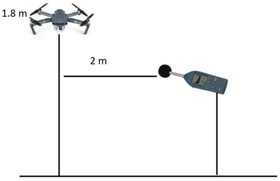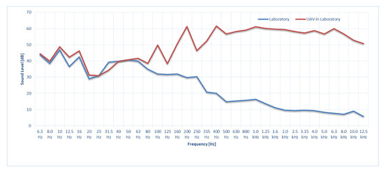 In Figure 4, the background sound levels recorded with the Norsonic 140 sound analyzer in laboratory conditions in the absence of the UAV (blue line) and the presence of the UAV (red line) are presented.
