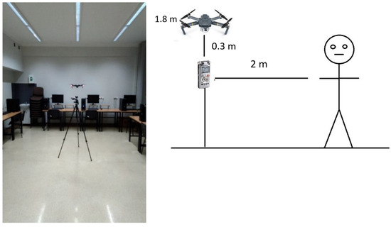 The UAV is DJI Mavic Pro. The maximum speed of the UAV is 40 mph (65 kph) in sport mode without wind. The maximum hovering time is 24 min (no wind). The overall flight time is 21 min (normal flight, 15% remaining battery level). The maximum takeoff altitude is 16,404 feet (5000 m). The GPS/GLONASS satellite positioning systems is used. During the experiment, the drone hovered at a height of 1.8 m in the laboratory.