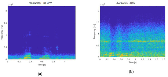 In Figure 5, the time–frequency analysis of the /backward/ speech command, spoken in laboratory conditions in the absence of the UAV and the presence of the UAV, is presented.