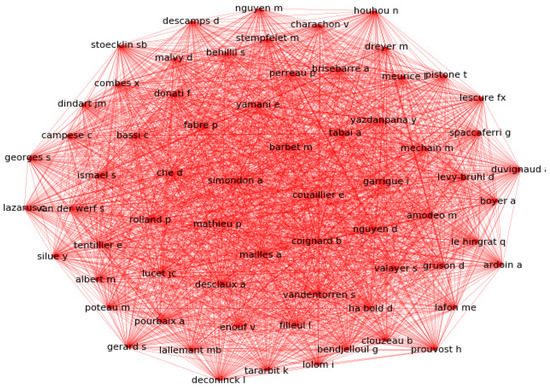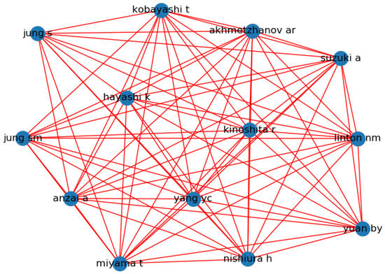 The author community with the largest number of published articles when the authors of all articles in February are interconnected. The actual author’s name is marked on each point, and the red edge is used to connect the points in the network.