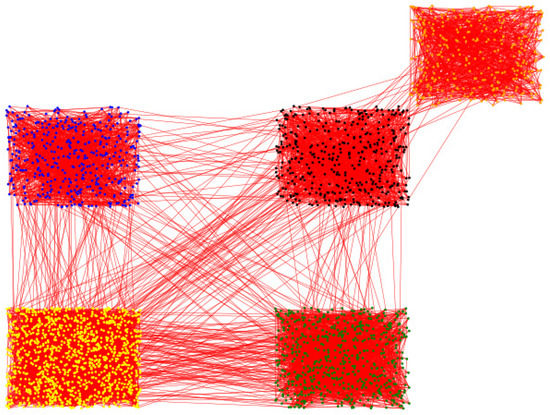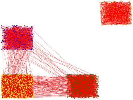Based on the above, we construct the network according to the construction method of the multi-field paper association structure network. The parameters values are set as , ::: = 10:6:4:5, = 2000, = 300, = 500, n = 10, = 3, = 1, j = 0.8, z = 0.8, :: = 5:3:2, and q = 0.1. Figure 5 shows the initial paper research network in the four fields of a, b, c, and d, while Figure 6 shows the newly formed network after the COVID-19 field is added.