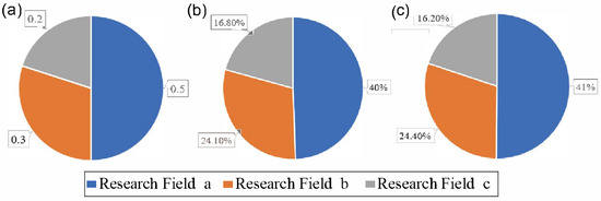 According to Figure 5 and Figure 6, before the outbreak of COVID-19, we can see that the initial a–b–c three-field paper association network and the initial d field paper network are not related and there is no edges between them. However, because of the emergence of COVID-19, many COVID-19-related papers have linked two kind of unrelated fields. To understand the impact of the large number of COVID-19 papers further, we conducted the related experiments. After the construction of the entire network was completed, we conducted a statistical analysis of articles with high connectivity degrees in the COVID-19 field. (In the experiment, we found all the authors in the articles with the top 5 largest connectivity degrees and all the authors in the articles with the top 6 largest connectivity degrees, respectively.) We found that. among all the authors of these articles produced during the COVID-19 pandemic, the number of authors in field a accounted for the most, followed by field b, and field c the least. As shown in Figure 7, among all the authors in the articles with the top 5 largest connectivity degrees, the ratio of the number of authors in the three fields of a, b, and c is 0.40:0.241:0.168, respectively. Among all the authors in the articles with the top 6 largest connectivity degrees, the ratio of the number of authors in the three fields of a, b, and c is 0.409:0.244:0.162, respectively. Because the papers with the larger connectivity degree are relatively important in the paper network, we can conclude that, in this special period of the COVID-19 pandemic, the higher is the correlation between the scholars’ research field and COVID-19, the more likely they are to produce important articles.