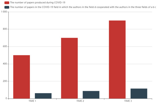 When 500, 700, and 900 articles were generated during the COVID-19 period, respectively, the number of articles in the COVID-19 field in which the authors in the field d cooperated with the authors in the first three fields are shown. Three parts (TIME1, TIME2, and TIME3) are shown in this figure.