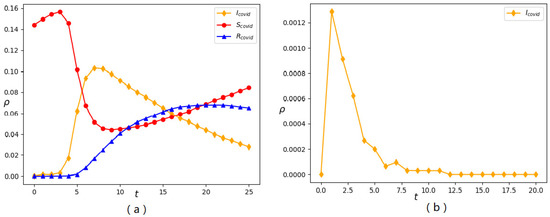 In the process of the propagation of COVID-19, researchers have made a lot of important contributions, and they put forward many new ideas and findings. With the emergence of some new articles in this field, some new discoveries were also produced. When a new discovery is produced, it will spread among researchers in the field, and researchers will explore whether their articles can be combined with this discovery. When the new discovery is spread in the paper association network, we can regard it as a new knowledge dissemination in the network. Based on the previously constructed multi-field paper association structure network, we analyzed the propagation of a new discovery related to COVID-19 in multiple fields, especially in the COVID-19 field. In the COVID-19 field, for a new discovery related to COVID-19, we assume that represents the article was not aware of the discovery when the article came into being, represents that the article was aware of the discovery and applied it to its own article when the article came into being, and represents that the article was aware of the discovery but the discovery was not useful for its article or the discovery was out of date as time wnt by, thus lost interest and was not applied. Similarly, in field i (), we assume that represents the article was not aware of the discovery when the article came into being, represents that the article was aware of the discovery and applied it to its own article when the article came into being, and represents that the article was aware of the discovery but did not apply it. Inside the COVID-19 field, we set the propagation probability of new discoveries to be and the probability of losing interest as r. When the discovery of COVID-19 is spread to other fields from the COVID-19 field, we set the propagation probability of new discoveries to be . Inside fields , we set the propagation probability of the new discovery (related to COVID-19) to be and the probability of losing interest as .