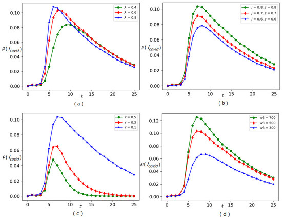 The influence of different factors on the spread of the new discovery when a new discovery is spread in the COVID-19 field. (a) The density change curve of with time when is different and the other parameters remain unchanged as m = 50, = 0.3, r = 0.1, = 0.05, = 0.15, j = 0.8, z = 0.8, and u = 0.05, = 500. (b) The density change curve of with time when j and z are different and the other parameters remain unchanged as m = 50, = 0.6, = 0.3, r = 0.1, = 0.05, = 0.15, u = 0.05, and = 500. (c) The density change curve of with time when r is different and the other parameters remain unchanged as m = 50, = 0.6, = 0.3, = 0.05, = 0.15, j = 0.8, z = 0.8, u = 0.05, and = 500. (d) The density change curve of with time when is different and the other parameters remain unchanged as m = 50, = 0.6, = 0.3, r = 0.1, = 0.05, = 0.15, j = 0.8, z = 0.8, and u = 0.05. The ordinate in (a–d) represents the proportion of articles containing this new discovery in the COVID-19 field to all articles in the network.
