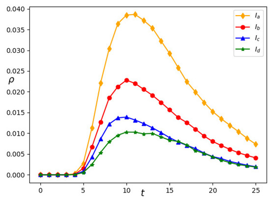 According to Figure 11, we can see that, if the value of a new discovery in the COVID-19 field is particularly high, then the new discovery will spread to the other adjacent fields. However, the number of articles applying this new discovery in other fields is smaller. The more relevant the field is to COVID-19, the greater is the number of articles that apply this new discovery in that field, as can be seen from the curve change of , , and in Figure 11. Similarly, we assume that, if a new discovery is produced in field d and the transmission rate of this new discovery is extremely high, then its application is extremely high. According to the network topology in Figure 6, we consider that the new discovery in field d is likely to spread to fields a, b, and c, thus it also proves that the barriers among fields a, b, c, and d will break down.