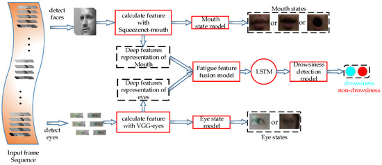 To solve these problems, we propose a driver drowsiness estimation model based on factorized bilinear feature fusion and a long-short-term recurrent convolutional network to detect driver sleepiness effectively, as shown in Figure 1. First, we designed two kinds of DCNN, which were used to extract the deep features of the driver’s eyes and mouth and to detect their states. Then, we used the factorized bilinear feature fusion method to fuse the deep feature representation of the eyes and mouth. Finally, we used the recurrent network LSTM to model the time variation of the drivers’ drowsiness to provide accurate detection of the drivers’ drowsiness under various driving conditions.