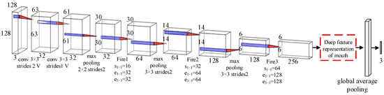 First, the input image with a size of is input into a convolution layer according to the time sequence, and the image size is initially reduced. Then, through multiple Fire modules and max-pooling layers, the size of the detected face image is reduced from 128 × 128 to 6 × 6. Finally, the mouth state related feature representation is further extracted through average pooling and full connection layers and we use the softmax layer of the model to effectively identify the mouth state. The convolutional layer hidden unit of the network model adopts a Rectified Linear Unit (ReLU) activation function. The layer marked “V” in Figure 3 represents the padding of “valid.”