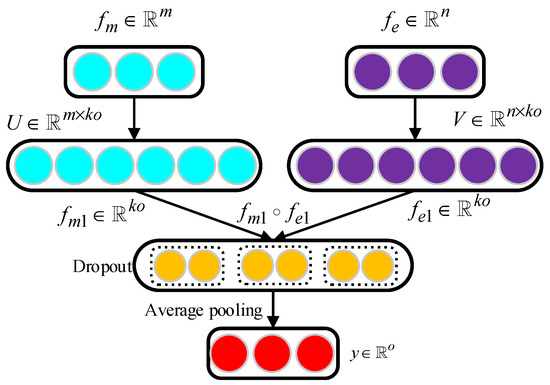 where and represent the two low-rank factorized matrices. is the factor or the latent dimensionality, and is an all-one vector. To obtain the output features through Equation (6), the weights to be learned are two three-order tensors and accordingly. At the same time, to further prevent the model from overfitting, a dropout layer is added after the element-wise multiplication interaction. The purpose of the dropout layer is to avoid overfitting of the model by randomly discarding some neurons in the feature fusion and output layer. Finally, an average pooling layer is used to gather the scores around the spatial position. Therefore, Equation (6) can be reformulated as follows: