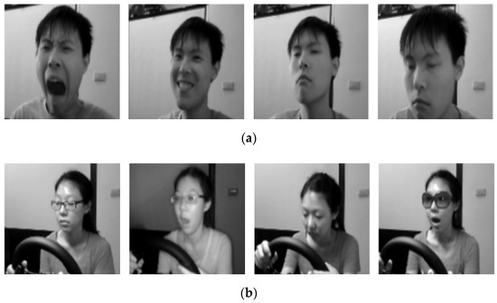 Example frames of the National Tsing Hua University drowsy driver detection (NTHU-DDD) video dataset with different situations. (a) Examples of changes in different facial states in the same scenario; (b) Examples of state changes under different scenarios.