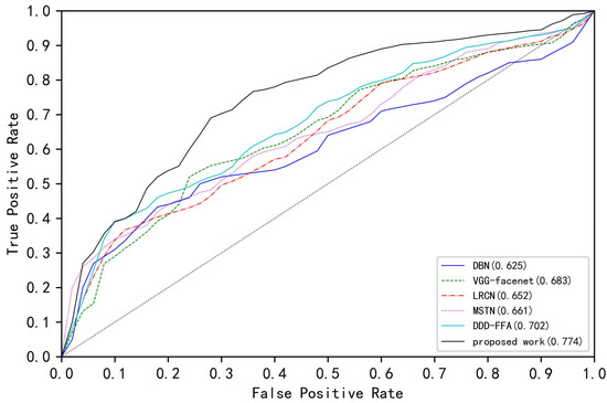 To further verify the robustness of the proposed driver drowsiness detection framework, we have made the receiver operating characteristic (ROC) curves of several network models on the evaluation dataset, as shown in Figure 8. The ordinate True Positive Rate represents the proportion of truly sleepy samples in the classifier judged as sleepy, and the abscissa False Positive Rate represents the proportion of all non-drowsy samples predicted to be sleepy. It can be seen from the ROC graph that compared with other network models, the proposed driver drowsiness detection framework has a larger the area under curve (AUC) on the evaluation dataset, which indicates that the proposed driver drowsiness detection system has a stronger ability to judge whether the driver is drowsy. The classification effect further proves the superiority and robustness of the proposed framework.