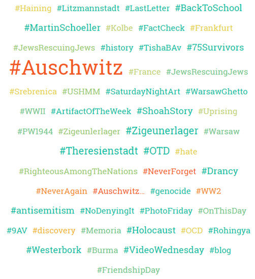 For Twitter hashtags, Figure 1 presents those most frequently used by the three Twitter profiles. We can see that #Auschwitz is clearly the most frequently used (N = 2.6k), although it does not attract a high level of engagement. Indeed, despite having a lower number of occurrences, hashtags such as #theresienstadt (N = 105) and #zigeunerlager (N = 61) generate higher engagement. Breaking down these figures by profile, we see that the use of #Auschwitz is found only on the AMM profile, while USHMM mostly used hashtags such as #otd [on this day] (N = 17) and #antisemitism (N = 8), while more frequently adopted hashtags on YV were #otd [n this day] (N = 59), #martinschoeller, (N = 19) and #75survivors (N = 18).
