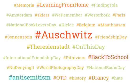 On Twitter, the most frequently used words by the three profiles are “educate” (N = 1.6k), “history” (N = 1.6k), “people” (N = 1.2k), “learn” (N = 1.1k), “online” (N = 1.1k), and “visit” (N = 1.1k). However, if we look at the profiles individually, we can see that these words largely coincide with those most used by the AMM profile, while “Nazi” (N = 76), “Holocaust” (N = 49), and “Jews” (N = 35) tend to prevail for USHMM and “Jews” (N = 46) and “Holocaust” (N = 43) tend to prevail for YV.