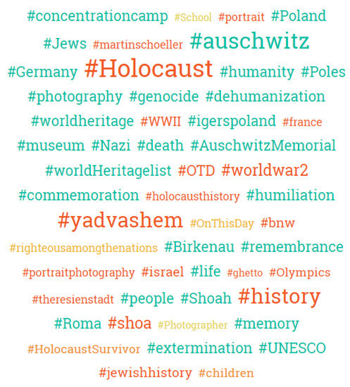 Finally, the third research question regards the type of content that mostly strongly engages fans/followers. This entailed latent semantic analysis of the most frequently used hashtags and words. The analysis has revealed a set of terms and hashtags that refer to the basic lexicon of Holocaust history, which attests to users’ strong interest in historical knowledge and less emphasis on the recent past or on analogies between contemporary events and WWII history. In this light, as Kansteiner [2] (p. 324) has highlighted, Holocaust-themed social media pages seem mostly to represent “a cyberspace address where [the subscribers] can hang out with peers, pursue their genocide memory interests by adding a thoughtful facet to their virtual selves, and then return to their comfortable lives”. Another matter of concern relates to the centrality of Auschwitz, both as a hashtag used by Holocaust organisations and as a broad topic of Holocaust discourse. This is reflected in the dominant popular perception of the Holocaust in which Auschwitz and related imagery represents an icon of the spatiality of the Jewish genocide [71,72,73]. Whether the centrality of “Auschwitz” overshadows—and hence inhibits—topical discourses on final solution topics that are less familiar to the wider public is an issue worthy of more in-depth future research, as is whether it poses problems of the overall paucity of Holocaust remembrance, such as the Holocaust by bullets [74].