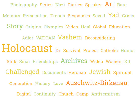 Given the lack of hashtags use on YouTube, the analysis focused exclusively on word frequency. The results show that the posted videos cover a range of topics, with a prevalence of words such as “Holocaust” and “Auschwitz–Birkenau” (Figure 4).