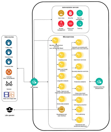 The high-level platform architecture presented herein provides the required methods for LEAs to accelerate their investigations and remain aware of significant (cyber)criminal threats by successfully integrating massive data streams. The system architecture is especially designed in order to meet performance and resiliency requirements at scale.