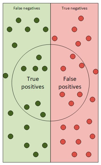 Precision, as can be seen in Equation (7) is a number between 0 and 1 and can also be expressed as a percentage. An illustrative way to understand the meaning of the true positives (TP), false positives (FP), true negative (TN), false positives (FN) and false negatives terms is in Figure 2.