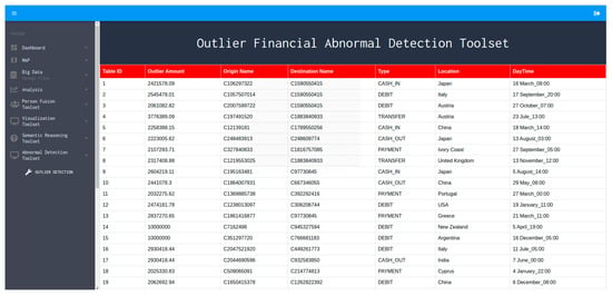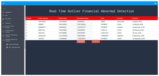 The abnormal behavior detection engine is accessible through a GUI. As shown in Figure 4, the outcome of the algorithm execution is retrieved and provided in a table structure, which is populated after selecting the relevant process. The algorithm receives as input the financial dataset, and using the auto-encoders algorithm, as described in Section 3, provides the outliers for the given input. The backend executes the computations required for the classification and the population of the table (Figure 4 and Figure 5) of the detected transactions that are characterized as “anomalous” transactions or possible “abnormal behaviors”. The populated table returns the actual amount of the abnormal transaction(s), the source and destination name of the transaction(s), the location name of the destination endpoint, the type as well as the date/time of the executed transaction(s), in order to provide sufficient visibility and awareness regarding possible fraudulent transactions during specific financial services. After the end of the execution, the results are stored back into a knowledge base (type of database) for future reference or re-use.