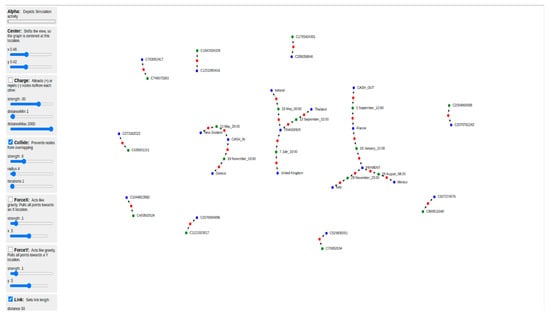 Regarding the customization of the tool, several visualization options are available, such as “filtering” using a specific degree of collapsing; “charging”, which is responsible for attracting or repelling nodes to and from each other, respectively; “zoom handling” for adding zoom functionality onto the graph; as well as “centering” for shifting the view of the graph into different points on the screen. Figure 5 is an indicative screen of entities and their interrelations, using predefined node colors. Red color is used to show the amount of the possible fraud transaction detected by the engine described in Section 4.1; blue color nodes show the source ids and types of each transaction and green color nodes depict the destination ids, the destination location and the timestamp of the transaction. The aforementioned color code is customizable depending on the dataset. Specifically, for this study, the colors are declared in an instantiated knowledge graph, which is populated with possible fraud or anomalous transactions after the execution of the abnormal behavior detection engine functionalities. The plethora of available customization options provides the users with the ability to focus their attention accordingly when exploring the populated knowledge, in order to reveal hidden patterns and relations between the depicted amount of possibly fraudulent transaction(s), names of the origin as well as the destination, types, places and dates/times of the transaction(s) in the current use-case analysis dataset.