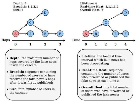 Cascades of fake news in a hop-based (left) and time-based (right) perspective. The root node A, in both perspectives, represents the first user to publish or create the fake news, while the remaining nodes represent users that actively forward or share the fake content. Adapted from [].