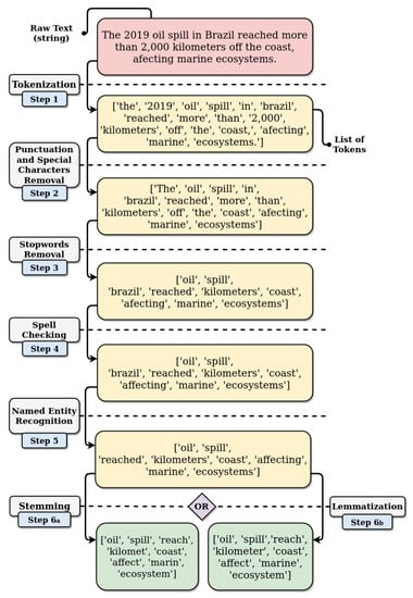 In Step 3, stopwords, or more frequent words, such as connectors, articles, and pronouns, are eliminated. This particular task is based on the principle that the higher the frequency of a word in the corpus, the less relevant information the word has. In Step 4, the spelling is corrected by comparing the token with its closest correspondent in the dictionary. Such a procedure is performed by calculating the Levenshtein distance, i.e., the minimum number of operations required to transform a name in the dataset, into another name contained in a dictionary of names. The recognition of named entities, Step 5, mainly identifies proper names, with subsequent removal of these names. Finally, to reduce unnecessary processing caused by possible redundancies between words, either by inflections or derivations, it is common to adopt Step 6a or 6b, with the following being stemming and lemmatization. In the task of lemmatization, we try to eliminate the possible variants or plurals of the same word, reducing them to the same lemma, known as the dictionary form. On the other hand, in stemization this reduction is made by transforming each word into its radical [,,].
