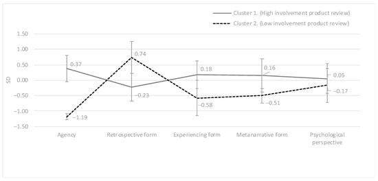 Profiles of the two clusters of product reviews based on the relative frequencies of narrative compositional categories (standardized data).