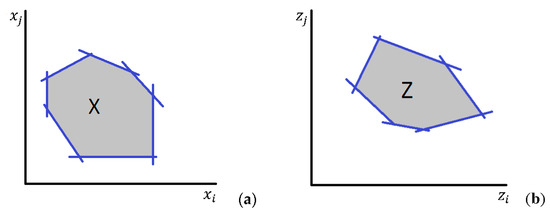 The EPH is the non-negative convex set in the space , delimited by the nondominated frontier, which is composed by the set of weakly nondominated criteria points and straight-line segments that connect these points. A point z is considered a weakly nondominated point when there is not another feasible point which satisfies , . We assumed the linearity of the system of inequalities due to the given matrix H and given vector h. Setting , where F is a given matrix, the EPH we want to find is [20]: