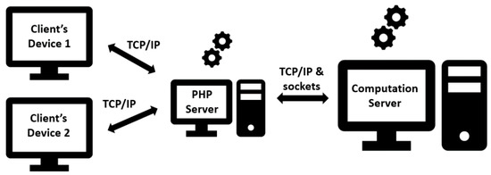 In this configuration (Figure 3), communication uses the Transmission Control Protocol (TCP), and only needs an internet protocol (IP) address and a port to make communication possible between the server and client. We defined a free port to communicate data between the two servers and a source address to permit the correct communication. In our case, the source address is our server PHP IP. Based on this source address, the socket is used to send and receive data from the computation server to generate the vertices and constraints of a mathematical programming problem, generating the EPH. This schema of communication is definitely convenient to acquire solutions and improve decision-making, because mathematical programming problems supporting forest management and planning typically need to be analyzed in real time by decision-makers.