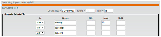 After uploading the *.lp file in the predefined format, we chose which criteria to maximize, minimize, or ignore for the construction of the EPH. Data were entered in the wgui (Figure 5) to run the iterative process to generate our Edgeworth–Pareto hull. In this example, we chose to maximize totcrop, and minimize leveldrp and lakepol. A constraint was introduced in the criterion totcrop (totcrop 80%), and all other criteria were unconstrained. The generation of the EPH ran in a few seconds, and its approximation was built with an associated error of 0.09649937 (discrepancy = 0.09649937 < 0.1; discrepancy reflects the error associated with the representation error of the real Pareto hull in the iterative process). The EPH is represented by 11 facets (polytope’s features, line segments in 2D, triangles in 3D, etc.) and 15 tops (which are a generalization of slicing a reflexive polytope; a formal definition can be found in Bouchard and Skarke [35]). After the communication between the PHP server and the computation server, the EPH was defined and was ready to be represented in the IDMs as the known Pareto frontiers.