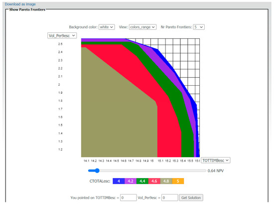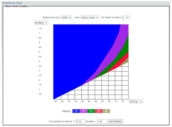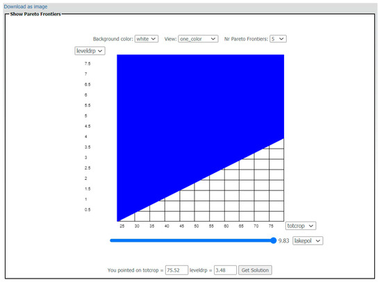 The result of our EPH computation has five colored slices and their Pareto frontiers (Figure 6). The five colors show the variation in the variable lakepol, with totcrop on the horizontal axis (limited by the constraint totcrop ≤ 80%), and leveldrp on the vertical axis. The configuration of the Pareto frontiers is easily changed by changing the criteria represented on the axes. The user can take a snapshot of the decision map (Figure 6), which is saved in a *.jpg file (hyperlink “Download as image”). After choosing a point on the IDM, the decision-maker can get the optimal solution according to his/her decision, as the corresponding point on the nearest Pareto frontier minimizing the Chebyshev distance (), similar to goal programming methodology. The optimization result was saved online either in a CSV file or in an XML file and represents a strategic management plan for forest management.