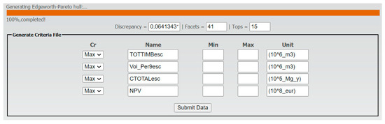 In this section, we provide a small example of an application in forest management. The reader is referred to [36] for a detailed description of the case study area. The tool was used to support a collaborative planning process involving several stakeholders and targeting the provision of several ecosystem services over a 90-year planning horizon. Indeed, a version of this application of our decision tool is included in wSADfLOR [36]. Figure 8 shows the wgui used for the user to choose the criteria and additional constraints they want to include, for example, maximum and minimum limits for each criterion. Given that input, the EPH is generated. The criteria considered were: total wood volume harvested and thinned for all forest species considered (TOTTIMBesc, measured in 106 m3); standing volume at the end of the planning horizon or volume of ending inventory (90 years), (Vol_Per9esc measured in 106 m3); the average carbon sequestration during the planning horizon (CTOTALesc, measured in Mg year−1); net present value (NPV, resulting from the silvicultural operations and value of cut wood in the planning horizon, measured in 108 EUR). Definitions of discrepancy, facets, and tops are the same as in the previous example.