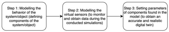 The first step in the methodology is creating the digital twin model for use throughout the study. In this step, the aim was to build a high-fidelity physical model of the real-life physical object or system under focus. The three main parts of this step are modeling the behavior of the individual components, modeling the behavior of the overall system (collection of components), and finally, modeling the sensors and fine-tuning the parameters [5], as shown in Figure 1 below.