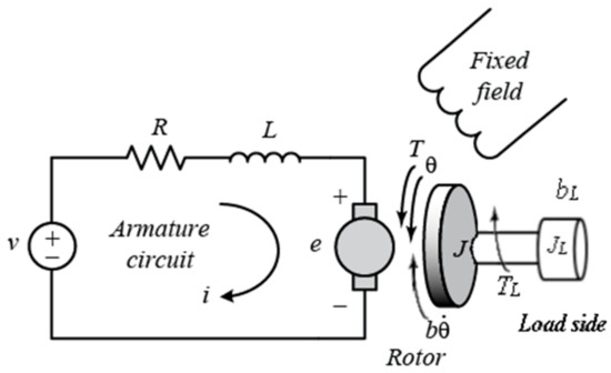 The system modeled consists of a motor and gearbox. The circuit includes components from electrical, thermal, rotational motion, and translational motion domains. The system represents the motor circuit of the main driver of a metal sheet roller machine. Two main base components of the model are the universal (electrical and mechanical components) motor, driven by a DC voltage source, and the gearbox, which reduces the rotation of the motor. The DC-driven universal motor of the circuit is designed based on electrical (Kirchhoff’s voltage law) and mechanical (Newton’s second law of motion) equations. The two governing equations of the motor are (Kirchhoff’s voltage law), where is the input voltage, is the motor resistance, is the motor current, is the motor inductance, and is the back electromotive force, and (Newton’s law), where is the electromotive torque, is the load torque, is the total inertia, is the angular velocity, and is the angular friction. The two equations are connected by the relationship between electromotive force and angular velocity (, where is the back electromotive force constant), as well the relationship between the torque and current (, where is the torque constant). Figure 2 below shows a simple physics-based schematic of a DC-driven universal motor [16].
