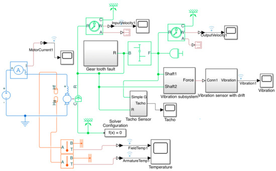 However, as stated, this study was focused on investigating the vibration signals. Thus, one of the key parts of the model is the vibration signal created by the subsystem that transforms the total rotational displacement at the output of the motor and gearbox to translational motion via masses and springs. The vibration signal is measured from the spring-damper chain found in this subsystem. The thermal domain components are temperature sensors, which can monitor the heat exchange between the motor and the environment. All measurements are gathered by respective sensors placed in the model (electrical sensors, thermal sensors, translational motion sensors, and rotational motion sensors). The main technical challenge in the model creation step was obtaining a reliable and accurate vibration output signal compatible with the digital twin model. With the initial version of the twin model, adding a subsystem that directly generates a vibration signal failed to yield desired results due to the operation mechanisms of the existing fault models. To ensure a satisfactory vibration output, the digital model was renovated, and several obsolete fault models and sensors were removed and replaced by new fault subsystems, as well as a subsystem to generate a vibration signal, creating more accurate vibrations from the digital twin. Another challenge was to find a suitable consistency tolerance for the solver configuration of the model. The default value for the consistency tolerance () provided by Simulink caused some simulations to raise error flags, and the interruption of the whole simulation process, due to calculational insensitivities of the motor current signals. This consistency tolerance was alleviated to to eliminate false error flags and obtain a smoother simulation process. The digital twin model was constructed in MATLAB Simulink, and all simulations/data generation and gathering related to the twin model were carried out in MATLAB. Figure 3 below shows the digital twin model created in MATLAB Simulink.