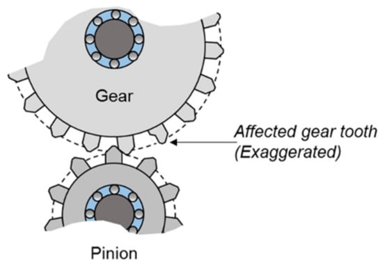 Fault modeling is a key part of a digital twin model used in predictive maintenance [17]. In this study, the main emphasis of the model was also the fault modeling. Two fault types were investigated and modeled in this study: gearbox tooth faults and vibration sensor errors. The tooth fault was modeled by inserting an undesired faulty torque at a fixed position (an error in a fixed tooth) in the turn of the gearbox shaft. A value of this disturbance torque of 0I indicates no error in the model. A visualization for gearbox tooth faults is shown in Figure 4. The second type of error source is in vibration sensors. In order to represent both the measurement errors and the intrinsic mechanical errors of these sensors, a simple offset was inflicted in the measurement of the vibration sensors; a value of 0 in this offset indicates no error in the measurement of vibration signals.