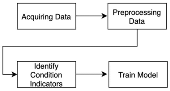 In general, a basic predictive maintenance workflow has four main steps [19]: data acquisition, preprocessing, identifying condition indicators, and training. An image depicting these four steps can be seen in Figure 5 below.
