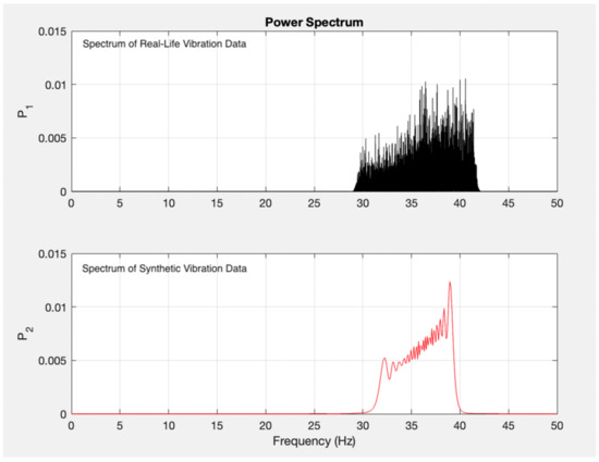 As shown in Figure 5, the first step of the algorithm is acquiring the data to be worked on. Each predictive maintenance workflow begins with data, either synthetic or real-life data [12]. In this study, synthetic data were generated via the digital twin model described in the previous subsection. The digital twin model is configured with error variables that describe the level of two error sources, namely gearbox tooth fault and sensor errors, as explained above. Changes in the values of these error variables in different simulation runs generate different vibration data. In order to ensure generalizability of the results, the values of error variables were assigned randomly in different simulations from a certain boundary of values. The synthetic data generation algorithm is briefly described in Algorithm 1 below. As well as the synthetic data, real life data were also used to test the created predictive maintenance algorithm (the testing process is explained in detail in the following section). Real life vibration data were acquired with a sampling period of 10 ms and the data included 411,863 datapoints. Furthermore, a frequency domain analysis was carried out to confirm the resemblance between the generated synthetic data and measured real-life data. Both real-life and synthetic data were transformed via the Fourier transform, and frequency contents were compared via power spectra and peak frequency analysis. The resulting graph of the power spectra analysis, shown in Figure 6 below reveals that the bandwidth of the synthetic data (spectrum shown in the bottom graph in Figure 6) and the bandwidth of the real-life vibration data (spectrum shown in the top graph in Figure 6) were both between approximately 30 and 45 Hz, and the peak frequencies were at approximately 39 Hz in both data. The boundary of power values for each data was also very close, indicated by the y-axis of both graphs in Figure 6.