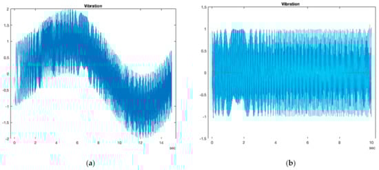 Effect of the preprocessing step proposed above, on an example vibration signal: (a) Vibration data before the proposed preprocessing step; (b) Vibration data after the proposed preprocessing step.
