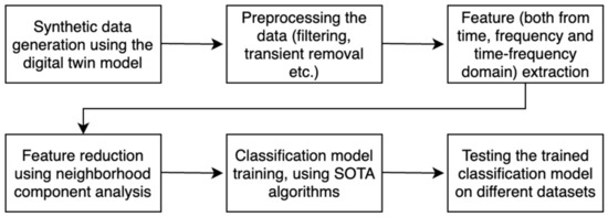 Synthetic data generation for predictive maintenance purposes is a developing concept drawing attention from various industrial sectors; thus, there have been many recent studies in this topic. For instance, in [12], there was a discussion of several different data generation approaches for use in predictive maintenance, including synthetic data generation based on a virtual simulation model or based on a simplified real-life physical model. However, for data generation, the authors suggested using, rather than a digital twin, a real-life simplified physical model of the system from which they actively measure data with placed sensors. In contrast, in this study, the synthetic data generation was heavily dependent on the digital twin model of the motor and gearbox; the data are the output of the virtual simulations conducted on this model. Several studies have recommended using virtual models for synthetic data generation (such as [5,13]). Most studies on predictive maintenance (especially on vibration data) found in a literature search have explained predictive maintenance workflow conceptually, rather than explicitly describing the steps of the workflow. In this study, we presented a complete workflow for the application of predictive maintenance for vibration signals. Steps in the proposed workflow are specialized to vibration data but can also be used to experiment with signals that have similar periodic characteristics (needed because of the proposed extracted condition indicators that belong in the frequency domain) and transient responses (needed because of the proposed pre-processing step), such as sinusoidal electrical circuits. Studies that have integrated deep learning structures (such as RNNs and LSTMs) into data-driven prognostic methods include [14], which explored transfer learning for remaining useful life predictions, and [15], which proposed adaptive time-series prediction for prognostics of lithium-ion batteries. Unlike these two papers, deep learning structures were not implemented in this study, as it was experimentally determined that other state-of-the-art classification algorithms functioned with acceptable accuracy for the experiments. However, it should be noted that deep learning structures are also compatible with the proposed algorithm.