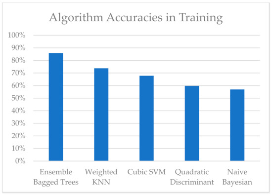 This section contains a discussion of the results of the classification accuracy after model training for the CWRU dataset and the synthetic data. First, Figure 9 below, showing the accuracies for the CWRU, reveals that, regardless of which algorithm is used to train the diagnosis model, the estimation of the current state of the system was better than chance. The best-performing algorithm was the ensemble bagged tree, with the accuracy of 85.85%. The yields in accuracy in classification were as follows: weighted KNN, 73.76%; cubic SVM, 67.82%; quadratic discriminant, 59.72%; and naïve Bayesian, 56.94%. The better-than-chance training accuracy for each algorithm, and the models’ ability to estimate the current state of the system with over 70% accuracy for some algorithms, showed that the algorithm works as desired for the CWRU dataset. In Figure 10, the accuracy results for the synthetic data are shown. Notice that the limits of the y-axis in Figure 10 are different than those in Figure 9.