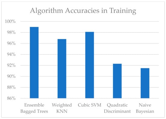 As can be seen from Figure 10, for all algorithms, the accuracy of state estimation was greater than 90%. The highest accuracy was once again with ensemble bagged trees, at 99%. The accuracies for cubic SVM, weighted KNN, quadratic discriminant, and naïve Bayesian were 99%, 98.1%, 96.8%, 92.3%, and 91.5%, respectively. It can be deduced that the proposed predictive maintenance algorithm worked exceptionally well for the synthetic data. However, there was a clear performance difference between the synthetic data and CWRU dataset because the measurements in the CWRU dataset were taken from a real-life device, making it practically impossible to obtain the same measurements and characteristics for a certain error class at different times. However, synthetic data generation is a theoretical process, and the characteristics of an error class can be exactly replicated in different runs. Thus, the classification gives very accurate results for synthetic data, as the characteristics for different classes can be exactly replicated for different elements in a particular class.