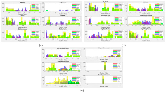 The following step was the identification of the condition indicators, also called features. Features are properties belonging to a particular dataset that change in an anticipated manner as the system itself changes or deteriorates [21]. Condition indicators are features involved in many different areas of signal analysis, including time domain features (e.g., mean and standard deviation), frequency domain features (e.g., power bandwidth and peak frequency), and time–frequency domain features (e.g., special entropy and special kurtosis). In this study, the following 18 different features from time and frequency domains were extracted from the preprocessed data: signal mean, median, RMS value, variance, peak value, peak-to-peak value, skewness, kurtosis, crest factor, median absolute deviation (MAD), range of cumulative sum, correlation dimension, approximate entropy, Lyapunov exponent, peak frequency, high-frequency power, envelope power, and spectral kurtosis. As seen, the features used belong to the time domain, frequency domain, and time–frequency domain. These features were chosen as being well-established types of evaluating signal data, in particular, signals that have distinct frequency content, as in the case of vibration signals [22]. After all 18 features were extracted from the data, neighborhood component analysis (NCA) was applied to the features for the two error sources in the model. NCA ensures that only relevant features (relevant condition indicators) are retained and that the others (those not useful in diversifying different error classes) are disregarded. This accelerates the final step of the predictive maintenance workflow, model training.