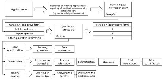 As can be seen in Figure 1, after natural information is collected and categorized, it has to be quantified prior to the analysis procedure. It should also be noted that natural digital information is only part of the big data generated by humans in the information environment. Its particular quality is that it is formulated in a natural form and requires decoding through human consciousness. This is what determines the need for its preliminary quantification using special tools. There are many quantification tools, but the most common ones are presented in Figure 1. Direct quantification is understood as conversion of the available nominal or ordinal lexemes into their alternative (numerical) form.