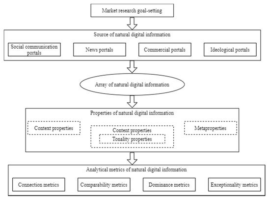 The model obtained has a universal character and can be used in market research with various goal setting. As can be seen in Figure 2, this model considers the sequence of the process implemented to analyze natural digital information and the cause-and-effect nature of formation of its qualities.
