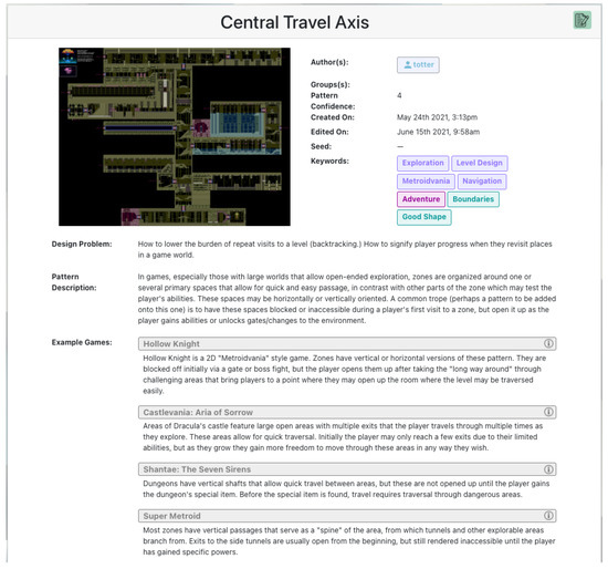 To ensure a uniform application of this template, as well as facilitate the use of patterns and pattern languages recorded using the template, I created a web-based tool for entering and accessing patterns. This tool uses a relational database to store pattern data. The creation of this database schema implied an ontological structure which will be discussed later in the Proposed Ontology for Pattern Language for Game Design Patterns section. Additionally, the creation of a public-facing repository for recording patterns necessitated the consideration of issues of privacy and access for patterns recorded using this tool. Aspects of the template that relate to these concerns are presented in the second optional part of the template as they are not intrinsic to patterns but are integral to this practical implementation of a pattern library.