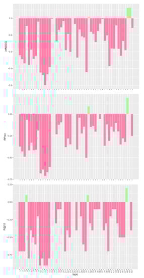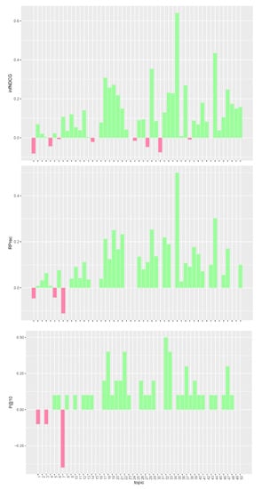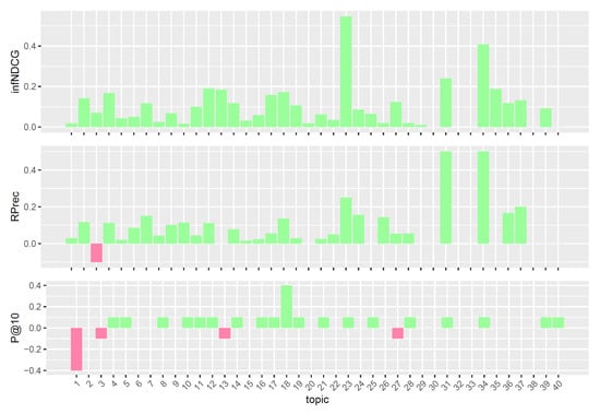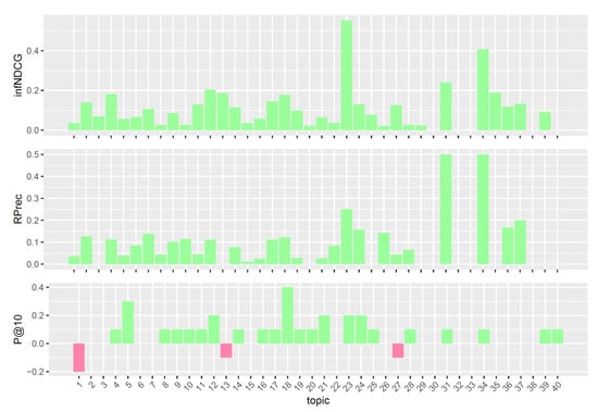 Per-topic difference between neop/reduced model and clinical trials median values. A topic is a synthetic case built by precision oncologists. Inferred nDCG (infNDCG), R-precision (Rprec), and precision at rank 10 (P@10) are shown. For a positive difference (model better than median), a green bar plot is shown, whereas for a negative difference (model worse than median), a red bar plot is shown.